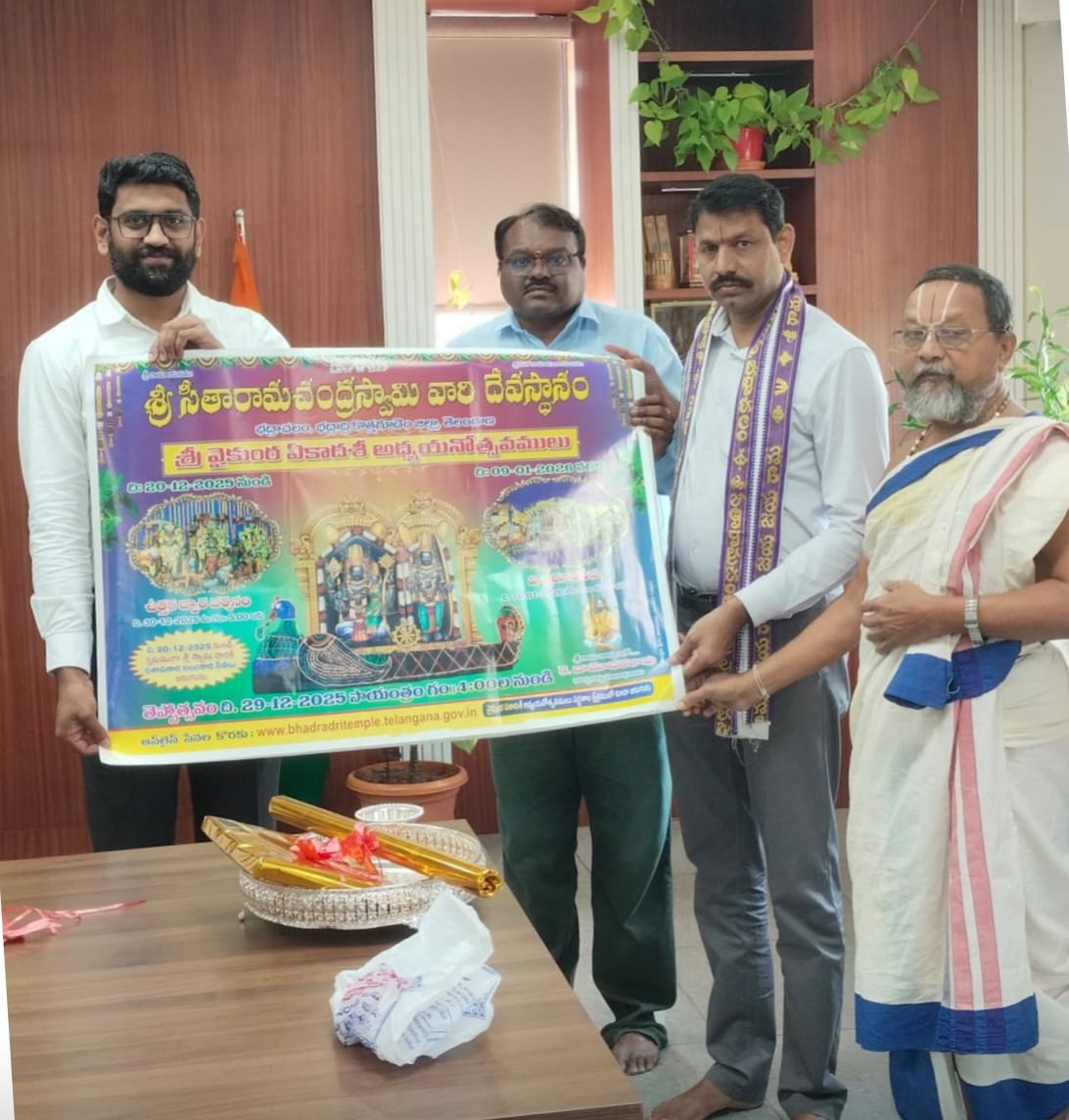 భద్రాద్రి కొత్తగూడెం, శోధన న్యూస్: ఈనెల 29 ,30 వ తేదీలలో జరిగే ముక్కోటి ఏకాదశి గోడ పత్రికలను భద్రాద్రి కొత్తగూడెం జిల్లా కలెక్టర్ జితేష్ వి పాటిల్ శుక్రవారం జిల్లా కలెక్టరేట్ కార్యాలయంలోని తన చాంబర్లో ఆవిష్కరించారు. ఈ సందర్భంగా ఆయన మాట్లాడుతూ.. ఈనెలలో శ్రీ సీతారామచంద్ర స్వామి వారి తెప్పోత్సవం, ఉత్తర ద్వార దర్శనంనకు భక్తులు అధిక సంఖ్యలో వచ్చే విధంగా పూర్తి సమాచారం తెలియడానికి గోడపత్రికలను ఉమ్మడి ఖమ్మం జిల్లాలోనే కాకుండా రాష్ట్రమంతటా అంటించడం జరుగుతుందని అన్నారు. అలాగే భక్తులకు కల్పించవలసిన వసతి సౌకర్యాలు, ఏర్పాట్లపై 15వ తేదీ మధ్యాహ్నం 3:30 గంటలకు సబ్ కలెక్టర్ రేట్ కార్యాలయంలోని సమావేశ మందిరంలోడివిజనల్ లెవెల్ అధికారులతో సమావేశం ఏర్పాటు చేయడం జరిగిందన్నారు. ముక్కోటి ఏకాదశి కార్యక్రమాన్ని పురస్కరించుకొని తెప్పోత్సవం, ఉత్తర ద్వార దర్శనంనకు వివిధ రాష్ట్రాల నుండి వచ్చే భక్తులకు కల్పించాల్సిన వసతి సౌకర్యాలపై సంబంధిత డివిజన్ అధికారులు పూర్తిస్థాయి నివేదికలతో సకాలంలో హాజరు కావాలని ఆయన అన్నారు. ఈ కార్యక్రమంలో దేవస్థానం ఈవో దామోదర్ రావు,అర్చక స్వాములు, సిబ్బంది తదితరులు పాల్గొన్నారు.